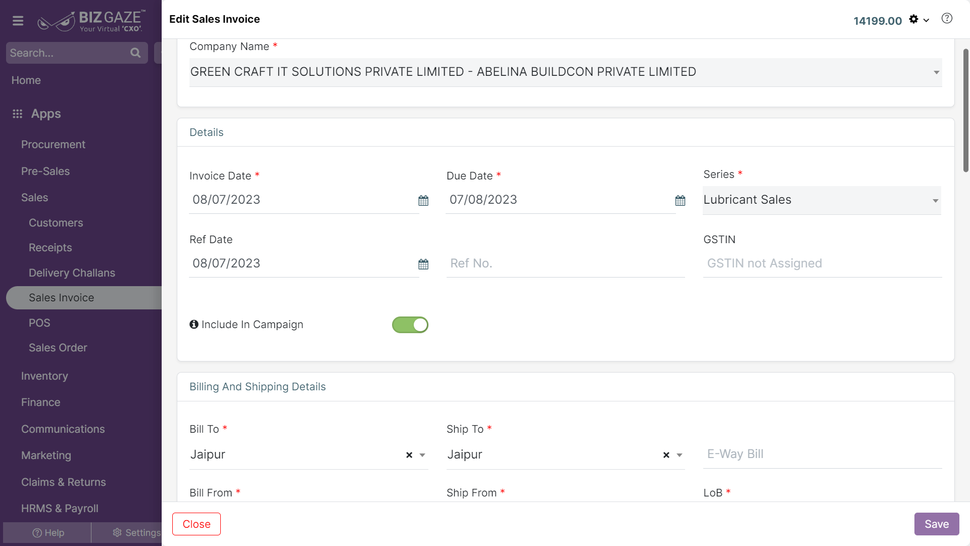 | GSTIN | By default system loads GSTIN number of the customer that was provided while Sales Invoice creation |