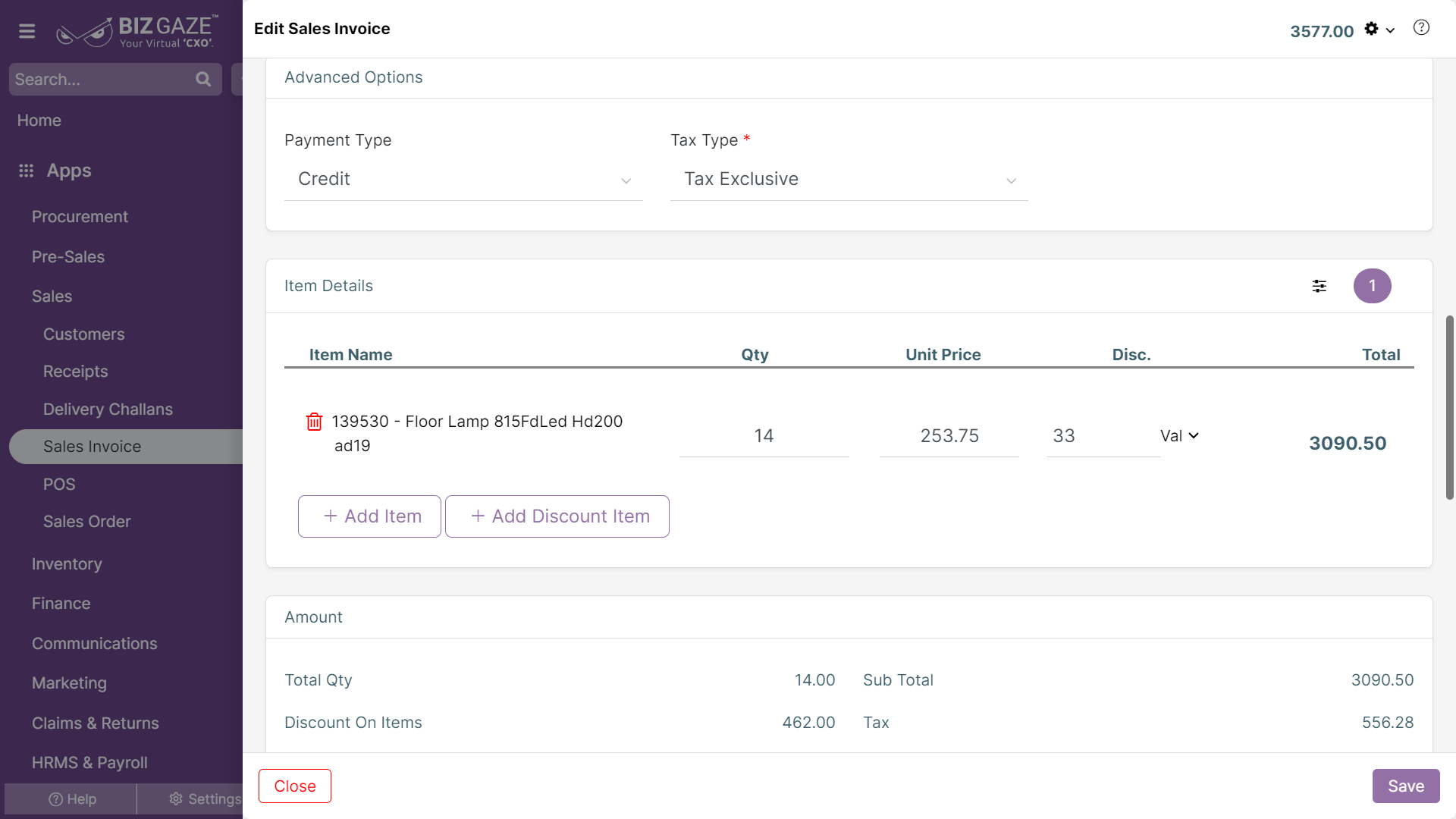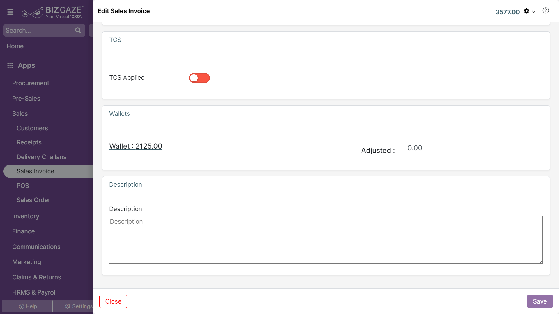 | Add Expense Item | User needs to click on the ‘Add Expense’ option to add a new Expense item in the Sales Invoice |