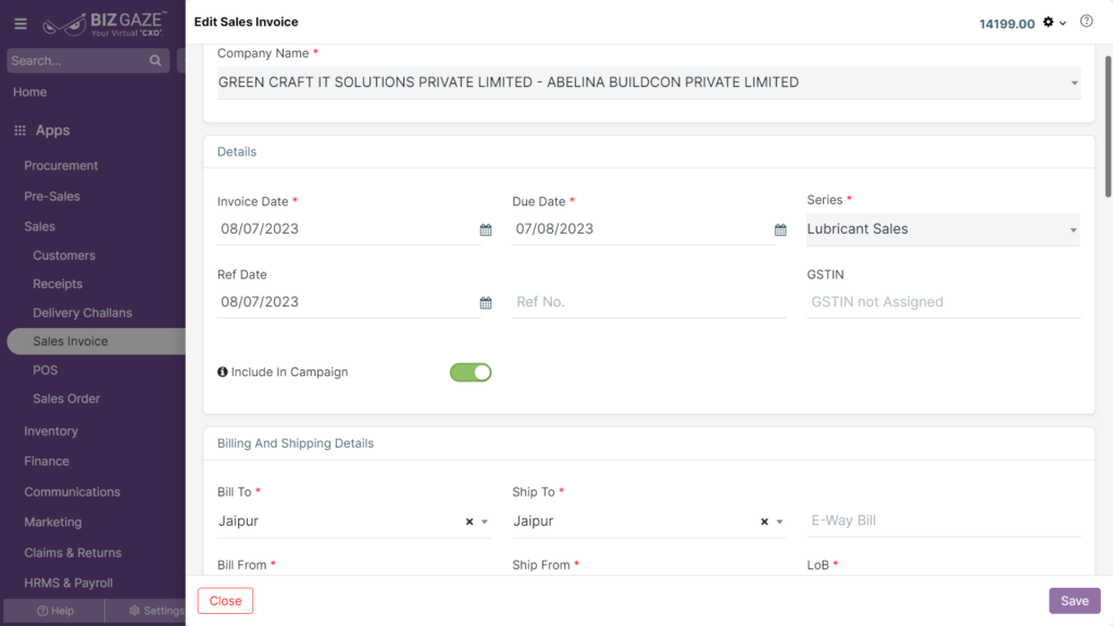 If user wants to update the already existing Sales Invoice details, user needs to click on ‘Edit’ option at the top right corner and fill in the required details.