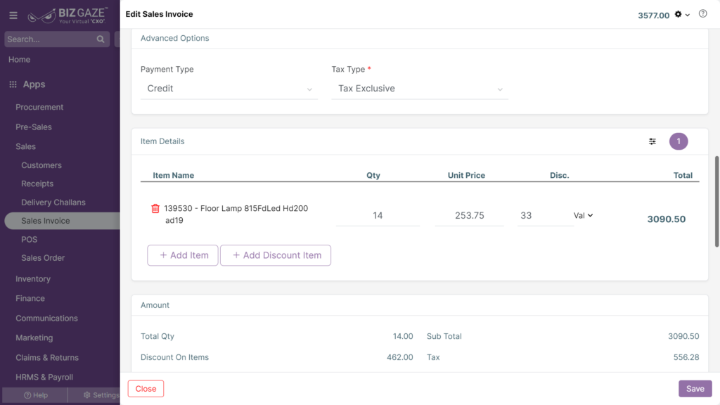 | Add Coupon Item | User needs to click on the ‘Add Coupon’ option to add a new coupon item in the Sales Invoice |